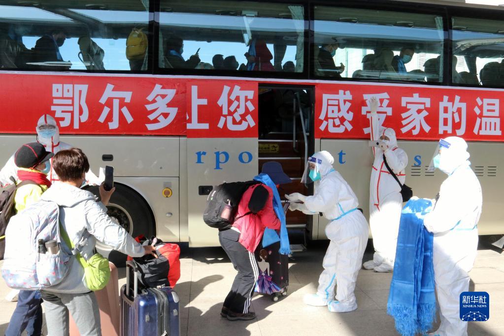 站臺外,一輛輛掛有“人民至上,生命至上”“鄂爾多斯讓您感受家的溫暖”等橫幅標(biāo)語的大客車旁,寫有“伊金霍洛歡迎您”“康巴什歡迎您”“東勝歡迎您”的標(biāo)識牌,十分醒目。