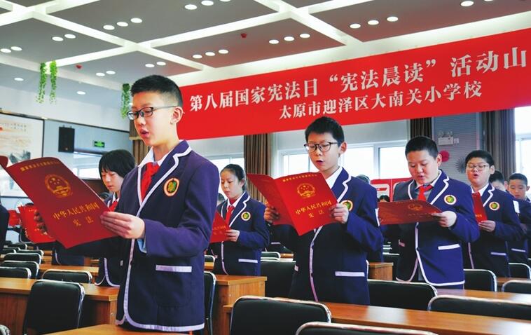 12月3日,迎澤區(qū)大南關(guān)小學(xué)開展“憲法晨讀”活動(dòng)。該校作為第八屆國家憲法日“憲法晨讀”山西分會(huì)場(chǎng),通過讓學(xué)生們朗讀憲法、收看直播等方式宣傳憲法知識(shí)。(徐浩軒 攝)