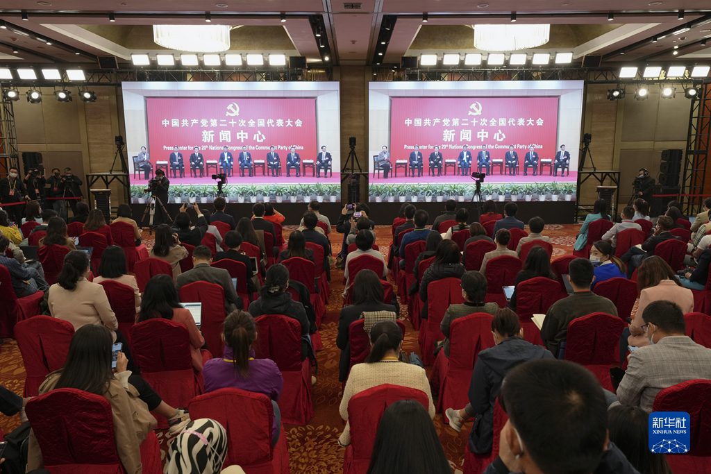 10月19日,中國共產(chǎn)黨第二十次全國代表大會新聞中心舉行集體采訪。山東、河南、湖北、湖南、廣東、廣西、海南代表團(tuán)新聞發(fā)言人出席,介紹代表團(tuán)學(xué)習(xí)討論二十大報(bào)告情況,并回答記者提問。新華社記者 陳建力 攝