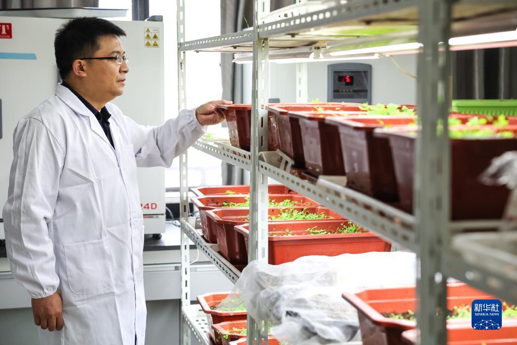 10月20日,貴州大學動物科學學院院長陳超在實驗室內(nèi)觀察新品種牧草的生長情況。新華社記者 歐東衢 攝