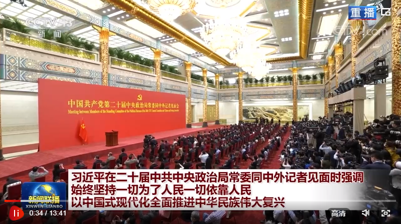 剛剛在中國(guó)共產(chǎn)黨第二十屆中央委員會(huì)第一次全體會(huì)議上當(dāng)選的中共中央總書(shū)記習(xí)近平和中共中央政治局常委李強(qiáng)、趙樂(lè)際、王滬寧、蔡奇、丁薛祥、李希,23日中午在人民大會(huì)堂同采訪(fǎng)中共二十大的中外記者親切見(jiàn)面。