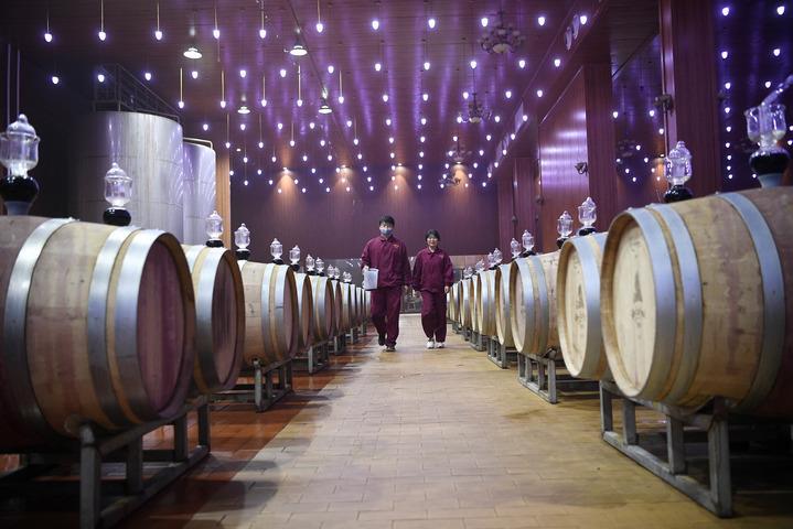 風(fēng)從賀蘭山深處吹來,拂過山腳下一眼難望到頭的葡萄園。一座占地面積達5000平方米的酒窖里,自動化設(shè)備保持四季恒溫恒濕,2000個橡木桶鱗次櫛比,國際葡萄酒大賽獲獎證書一個挨著一個,擺滿了十幾米長的陳列架。