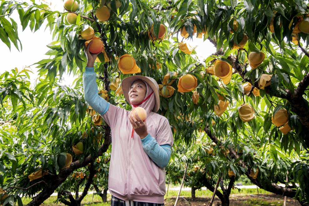 出生于1973年的姚文君種桃20多年,過去他家的7畝地散落在村里,東一塊、西一塊,有的種水稻,有的栽桃樹,干活很不方便。后來(lái)村里把分散的土地集中起來(lái)重新流轉(zhuǎn)。“小田變大田,有了集中連片的7畝地,又從別人手上租了3畝地。10畝桃園,每年為我們夫妻倆帶來(lái)30萬(wàn)元左右的收入。”姚文君說。