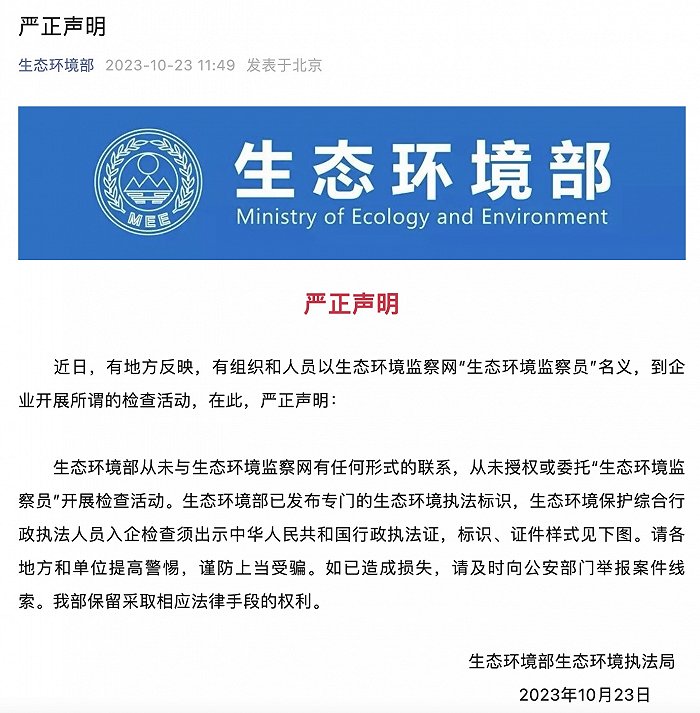 據(jù)生態(tài)環(huán)境部公眾號10月23日消息,近日,有地方反映,有組織和人員以生態(tài)環(huán)境監(jiān)察網(wǎng)“生態(tài)環(huán)境監(jiān)察員”名義,到企業(yè)開展所謂的檢查活動,在此,生態(tài)環(huán)境部嚴(yán)正聲明: