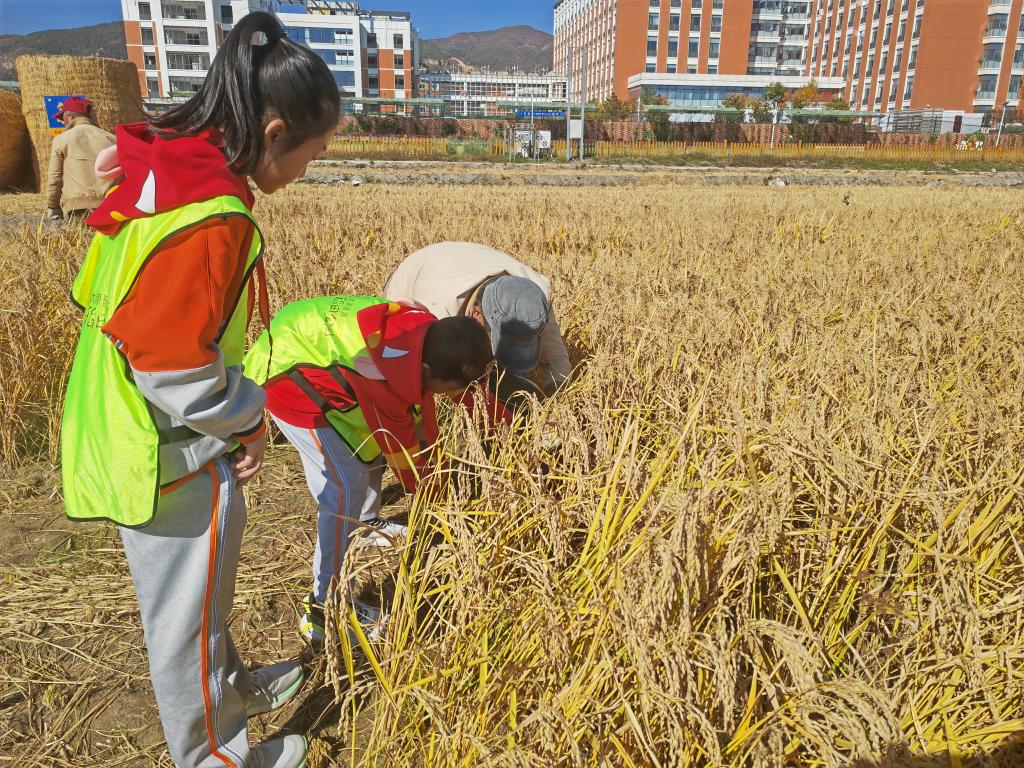 10月20日,小學(xué)生在工作人員的帶領(lǐng)下體驗(yàn)收割水稻。新華社記者 魏飚 攝