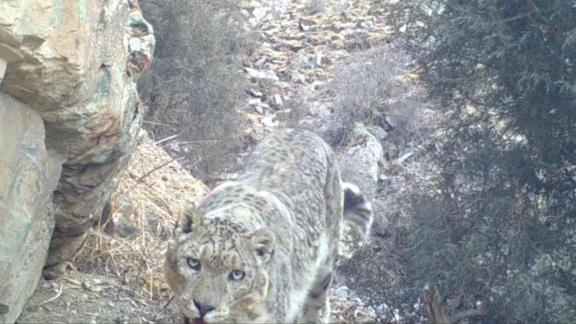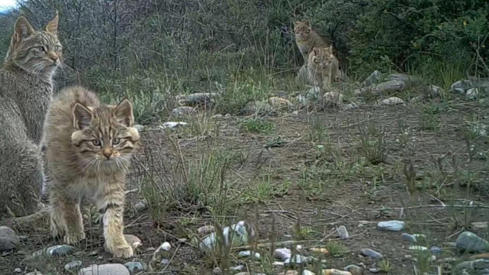照片中的“大萌貓”一張是漫步在草叢中的荒漠貓,另一張是行走在樹叢中的雪豹。二者都是國家一級保護(hù)野生動物。