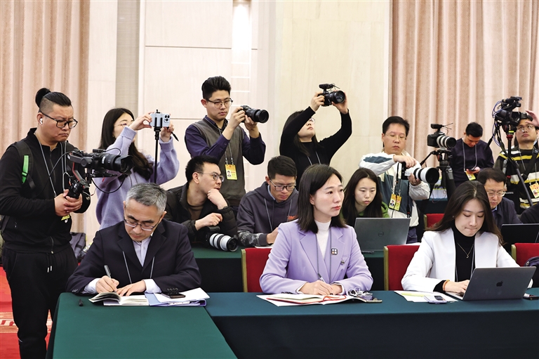 3月6日上午,陜西代表團(tuán)媒體開放日活動(dòng)在人民大會(huì)堂陜西廳舉行。當(dāng)天,共有來自人民日?qǐng)?bào)、新華社、中央廣播電視總臺(tái)、法新社、中阿衛(wèi)視等50多家中外媒體的70多名記者參加。