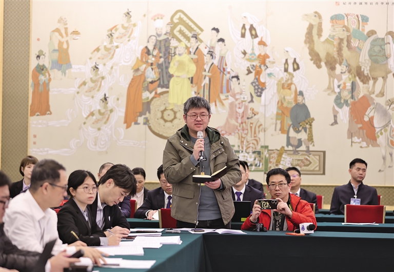 3月6日,中外媒體記者走進(jìn)北京人民大會(huì)堂,參加十四屆全國(guó)人大二次會(huì)議陜西代表團(tuán)媒體開放日活動(dòng)。圖為記者向代表提問。記者 母家亮攝