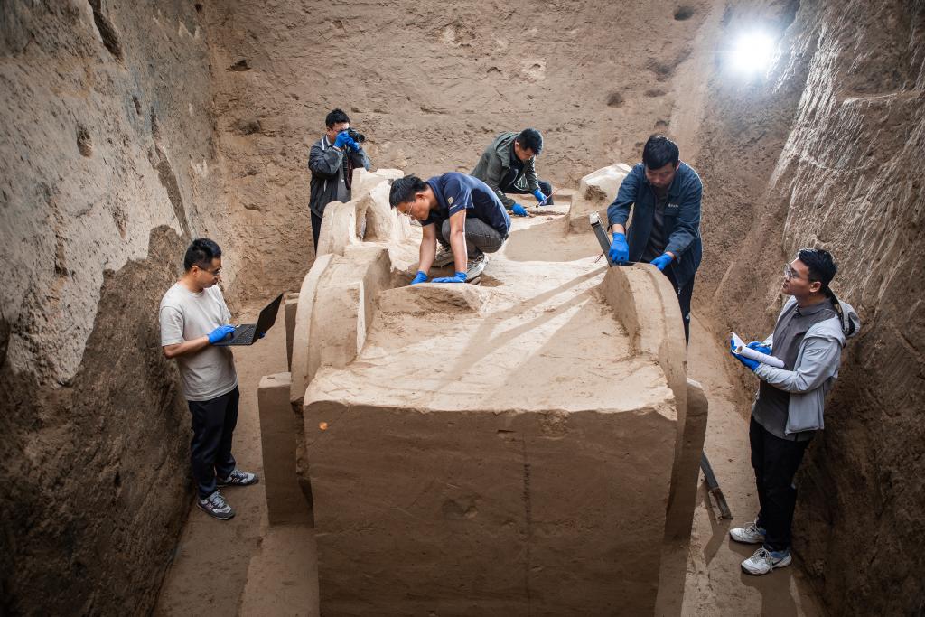 陜西省考古研究院寨溝遺址考古隊(duì)在陜西清澗瓦窯溝墓地M4號(hào)墓葬清理馬車(2025年9月11日攝)。新華社發(fā)